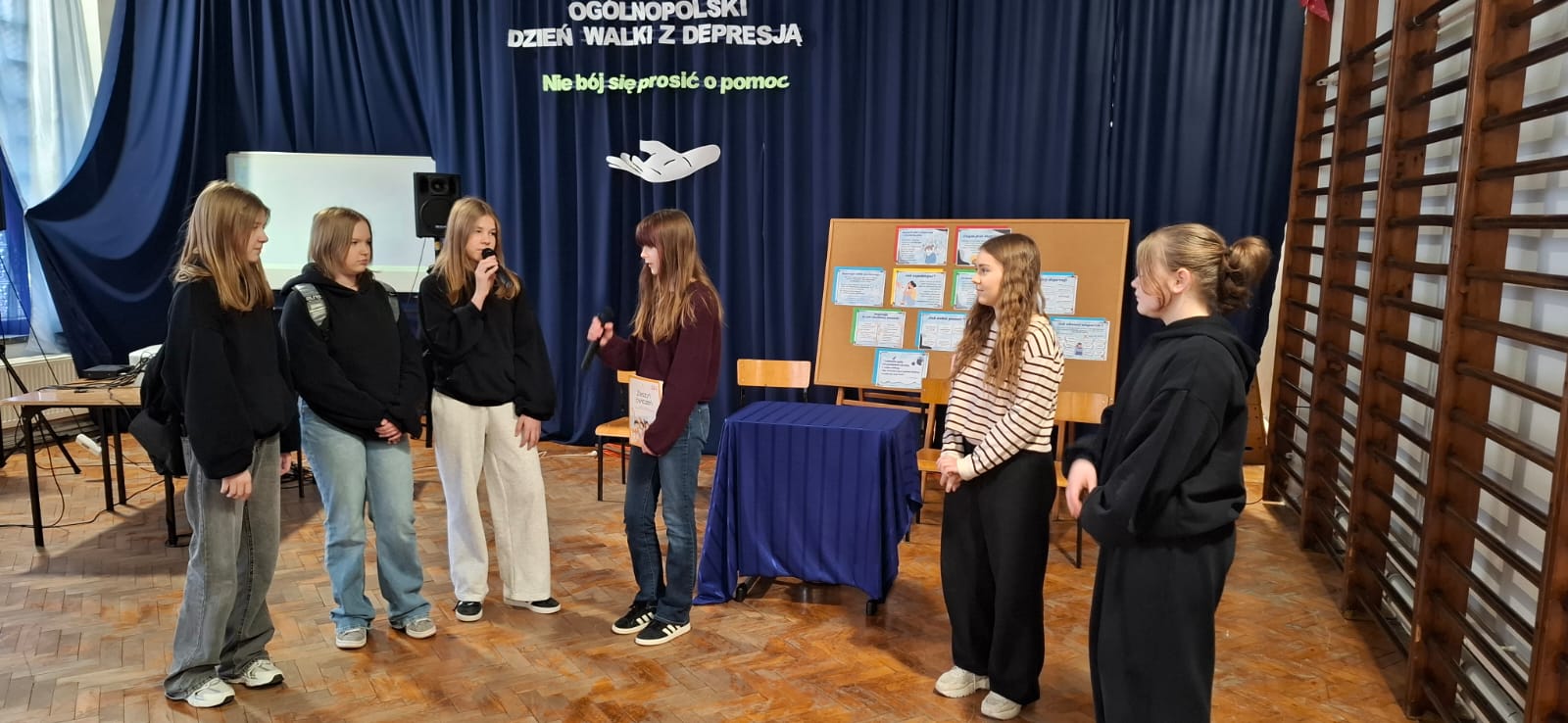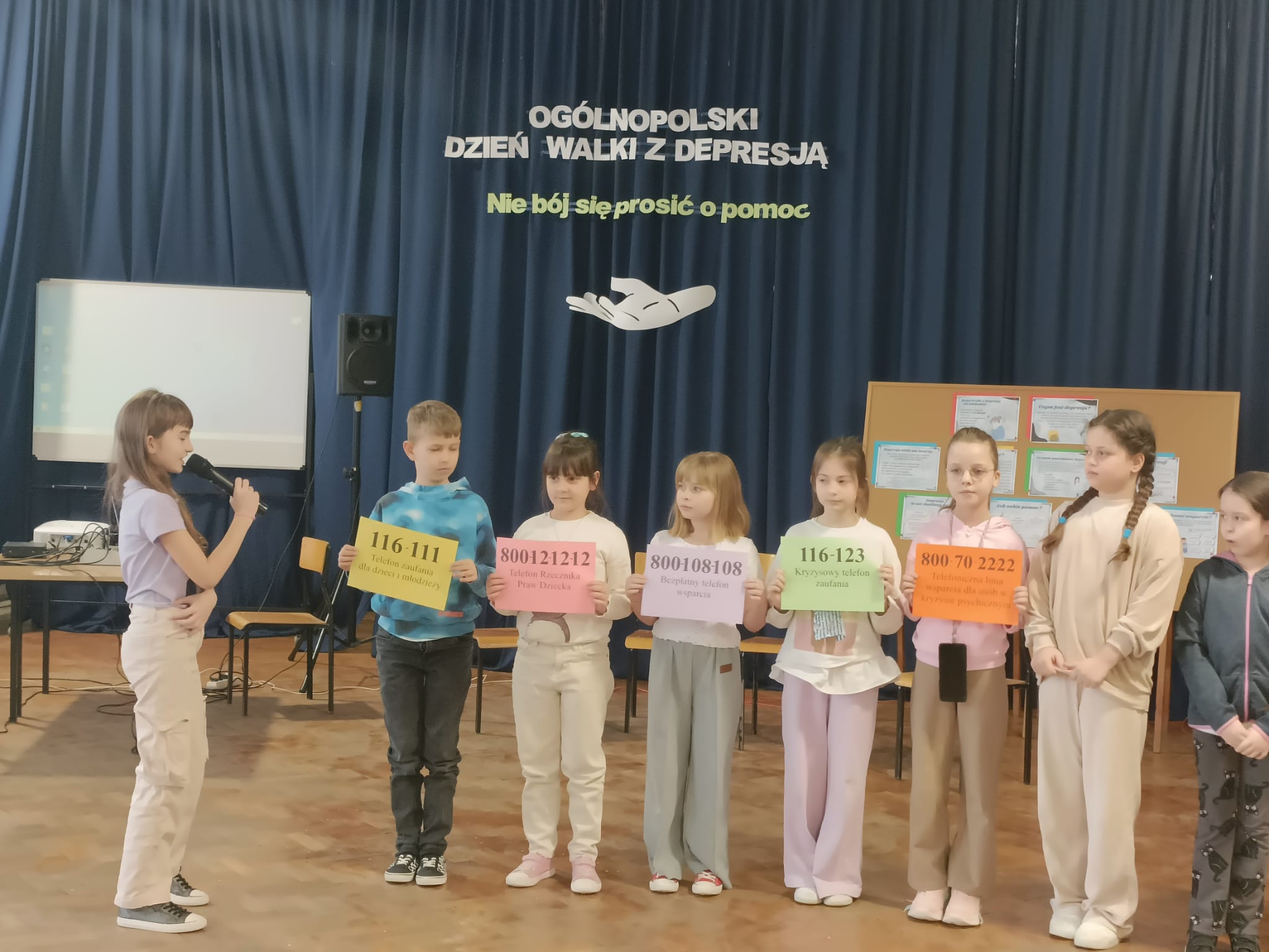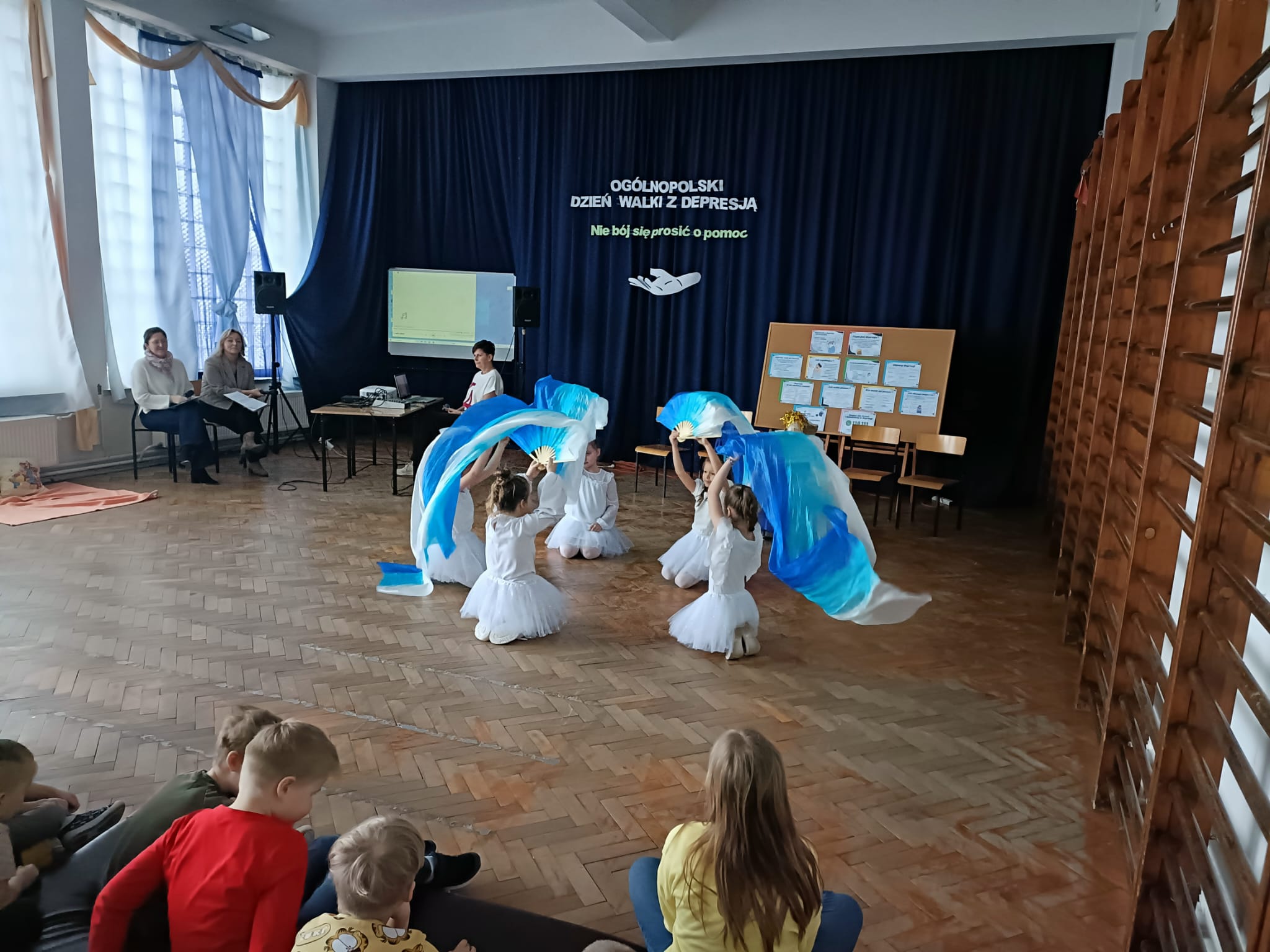 Kolejnym etapem obchodów Dnia Walki z Depresją był występ najmłodszej grupy uczniów kl. I, którzy zaprezentowali radosny taniec z wachlarzami, jako sposób na walkę ze smutkiem i chandrą. Następnie starsi uczniowie z klas VI-VIII zaprezentowali scenki teatralne, które skłaniały do refleksji, a także w żartobliwy sposób przedstawiały receptę na dobry nastrój. Podsumowaniem akcji było zapoznanie uczniów z ważnymi numerami telefonów, dzięki tej wiedzy każdy może otrzymać wsparcie i pomoc.