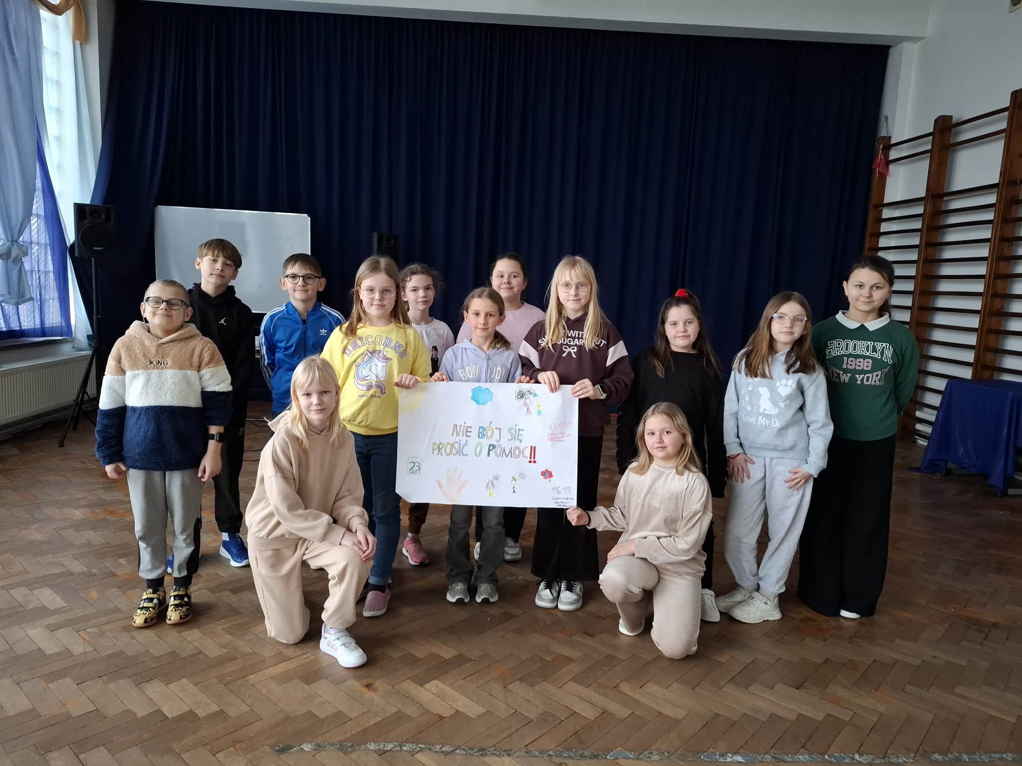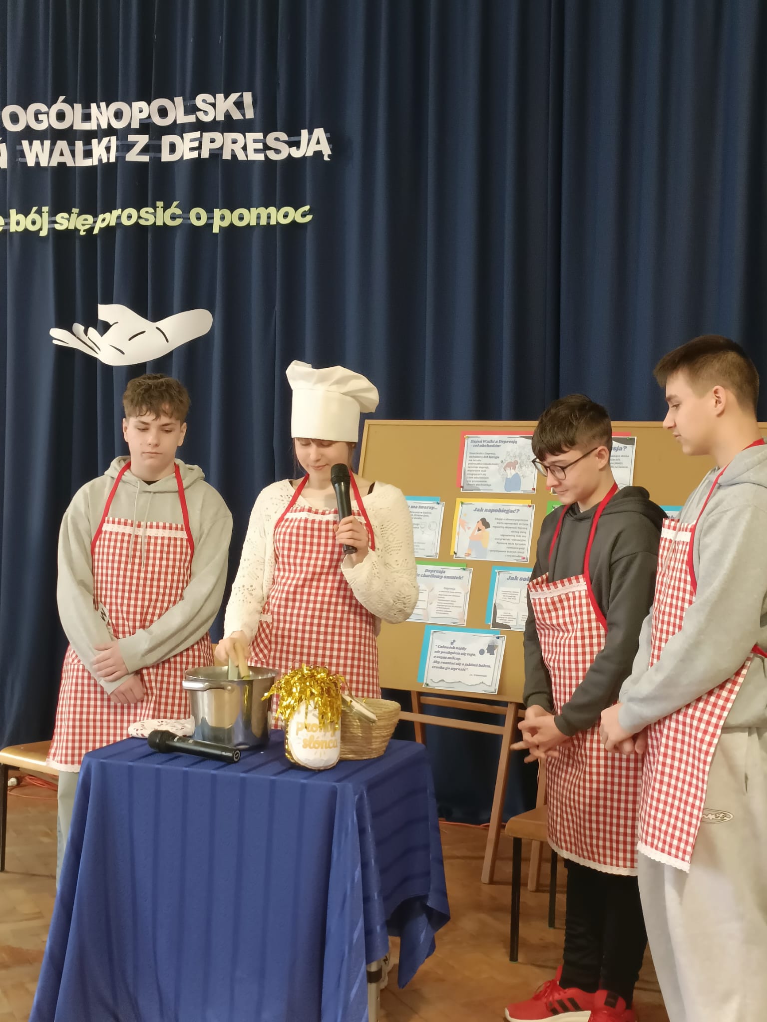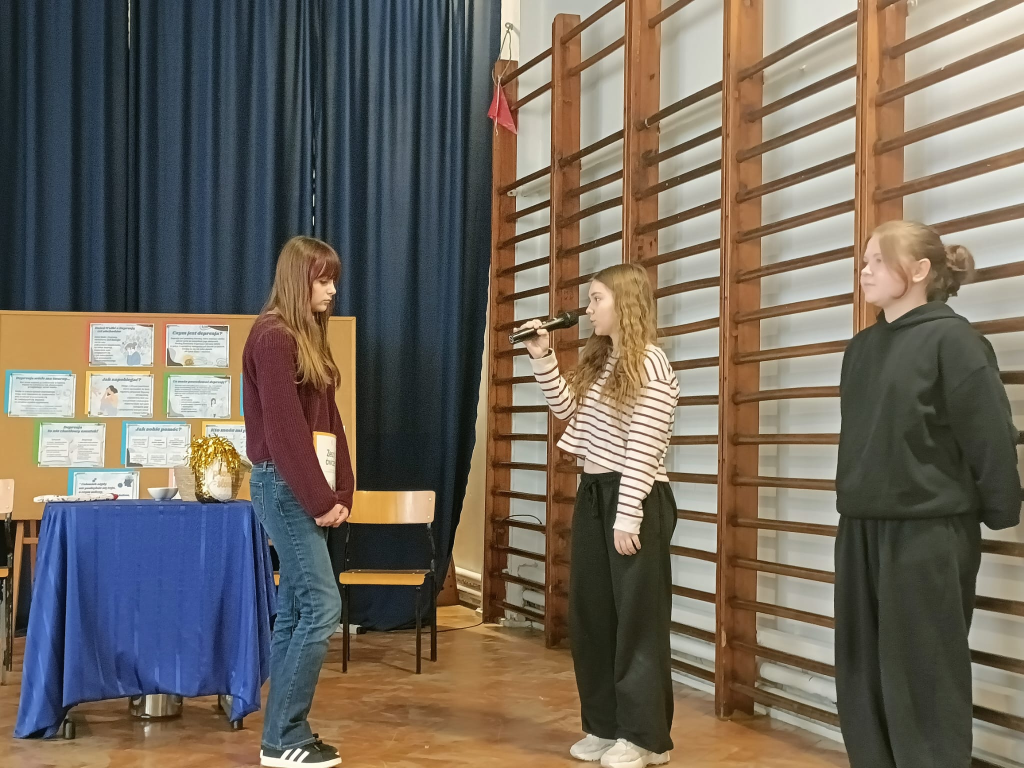Kolejnym etapem obchodów Dnia Walki z Depresją był występ najmłodszej grupy uczniów kl. I, którzy zaprezentowali radosny taniec z wachlarzami, jako sposób na walkę ze smutkiem i chandrą. Następnie starsi uczniowie z klas VI-VIII zaprezentowali scenki teatralne, które skłaniały do refleksji, a także w żartobliwy sposób przedstawiały receptę na dobry nastrój. Podsumowaniem akcji było zapoznanie uczniów z ważnymi numerami telefonów, dzięki tej wiedzy każdy może otrzymać wsparcie i pomoc.