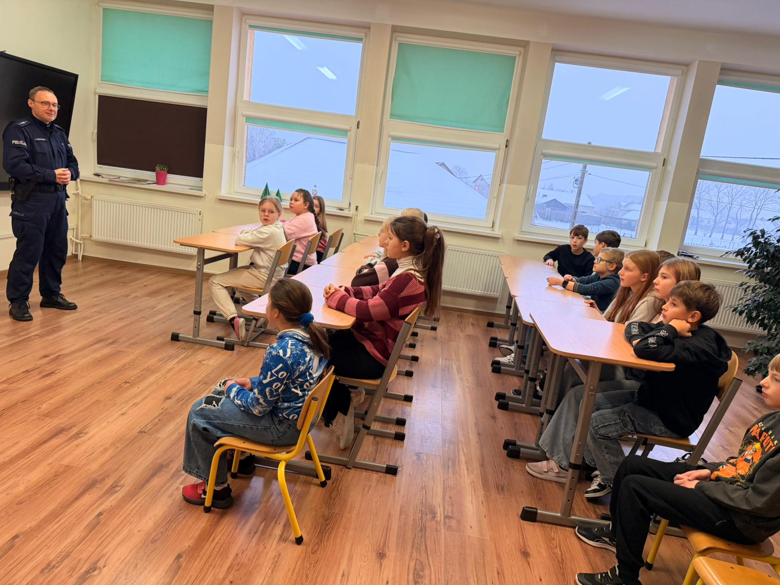 Policjanci przypomnieli zasady bezpiecznego zachowania podczas zimowego wypoczynku, ze szczególnym uwzględnieniem zabaw na śniegu i lodzie. Omówiono również zagrożenia związane z korzystaniem z Internetu, takie jak cyberprzemoc oraz zasady ochrony danych osobowych.