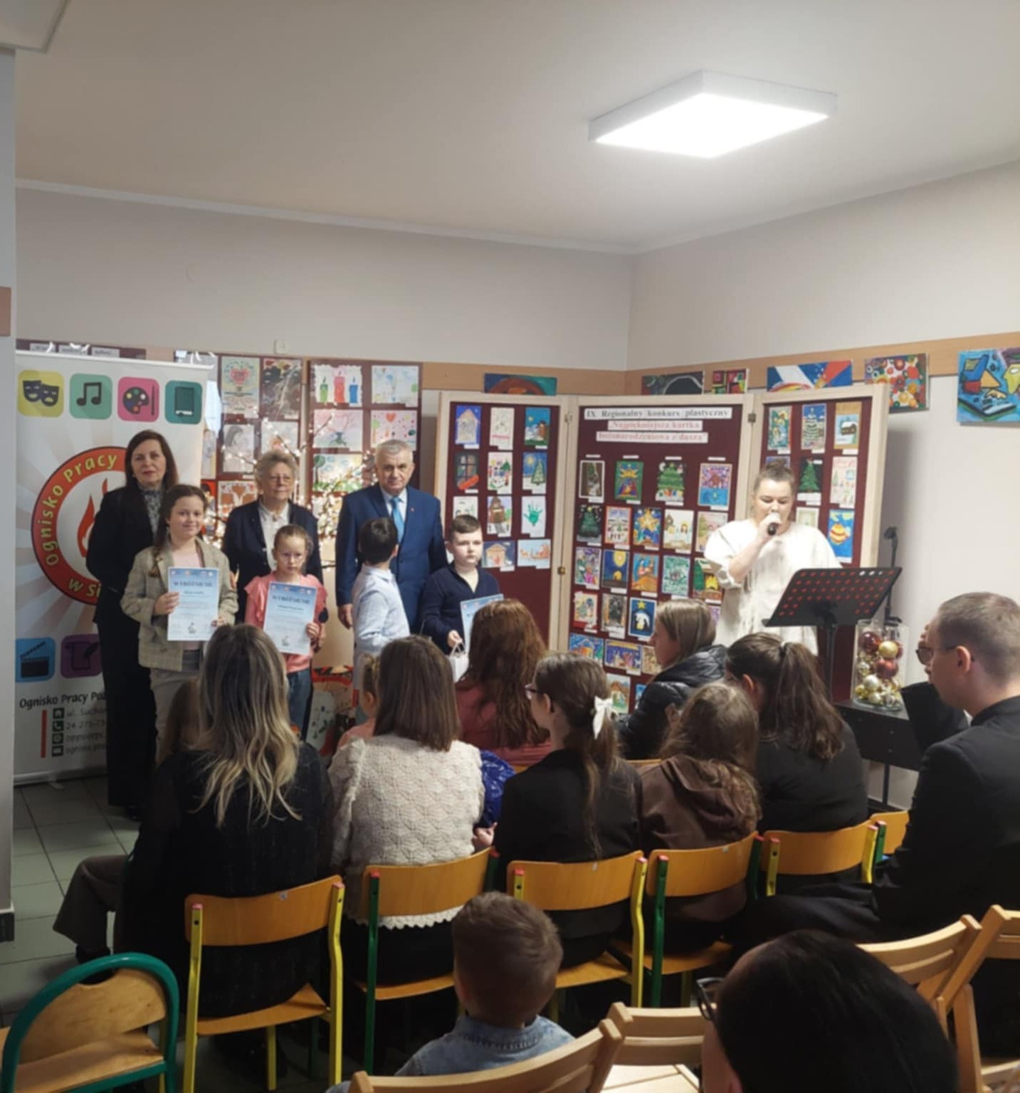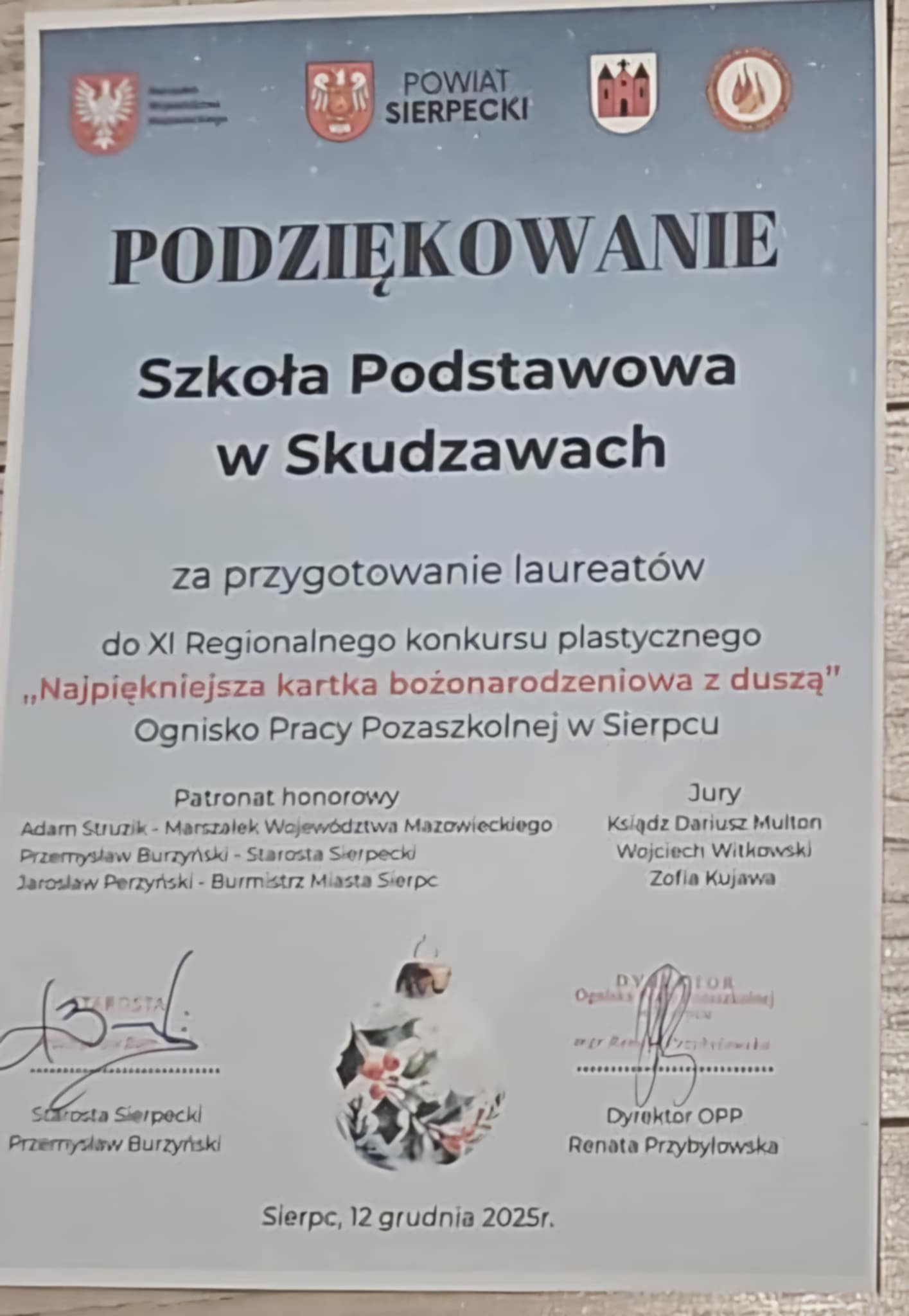 Z radością informujemy, że uczennica naszej szkoły otrzymała wyróżnienie w XI Konkursie Regionalnym " Najpiękniejsza kartka bożonarodzeniowa z duszą" zorganizowanym przez Ognisko Pracy Pozaszkolnej w Sierpcu. Gala finałowa odbyła się 12 grudnia 2025 r. Wyróżnienie zdobyła : Alicja Kudła z klasy III pod opieką wychowawcy Bożeny Wichrowskiej. Konkurs cieszył sie ogromnym zainteresowaniem, wpłynęły 792 prace z 46 placówek. Konkurs byl wyjatkowy, gdyż miał cel charytatywny. Serdecznie gratulujemy laureatom oraz wszystkim uczesnikom konkursu. Niech każda stworzona kartka stanie się cichym nośnikiem radości, ciepła i prawdziwego bożonarodzeniowego przesłania płynącego z serca.