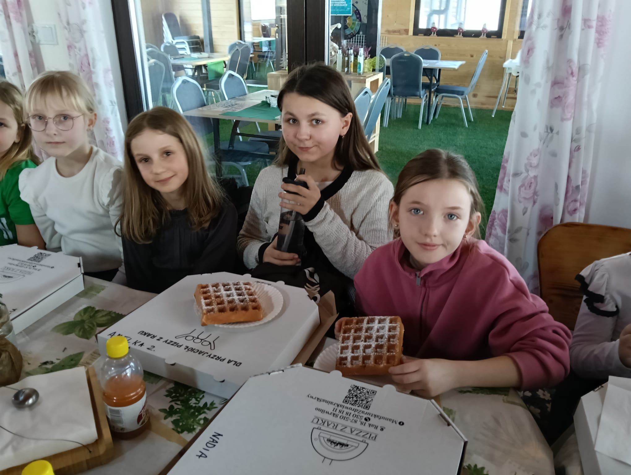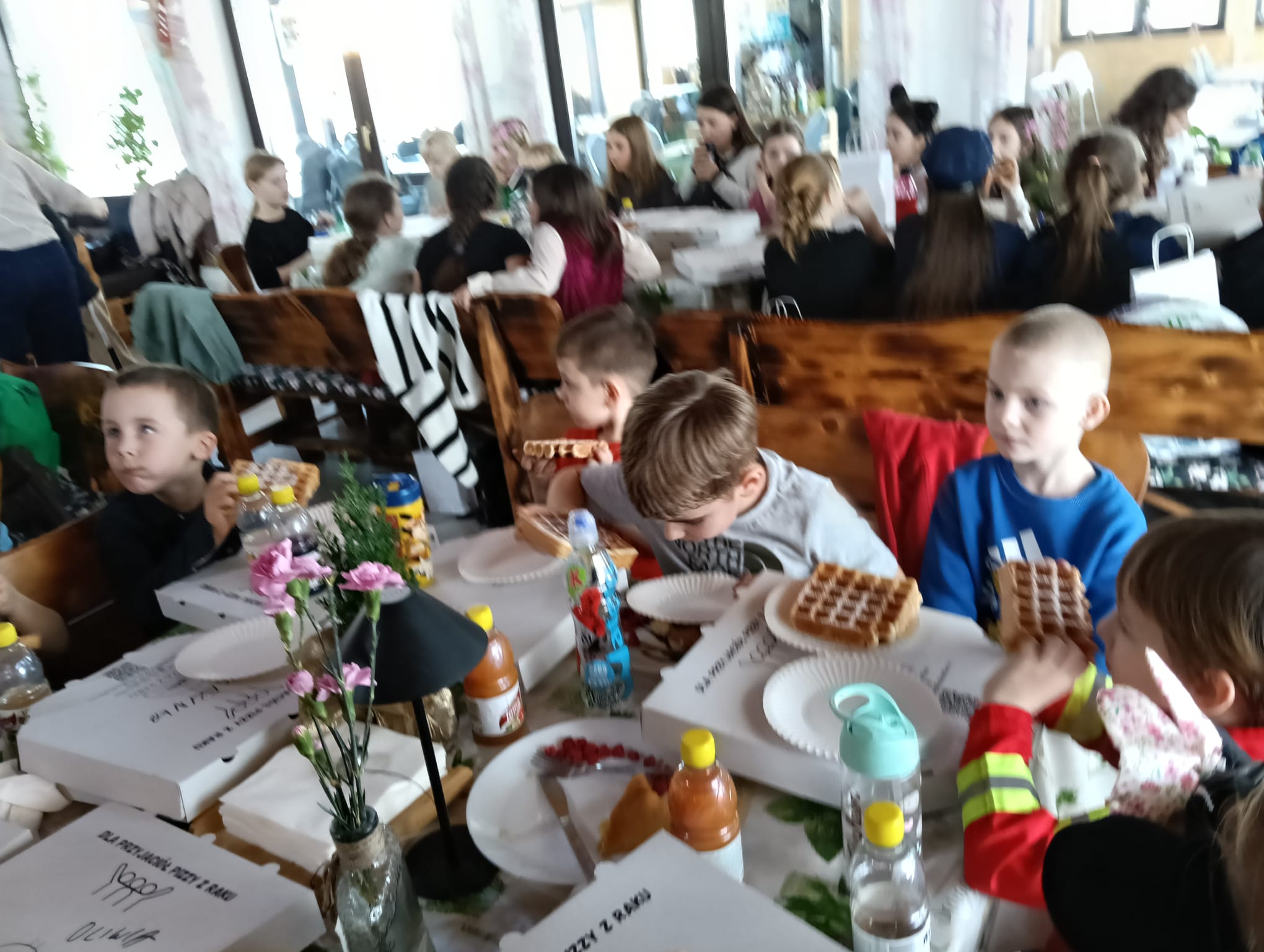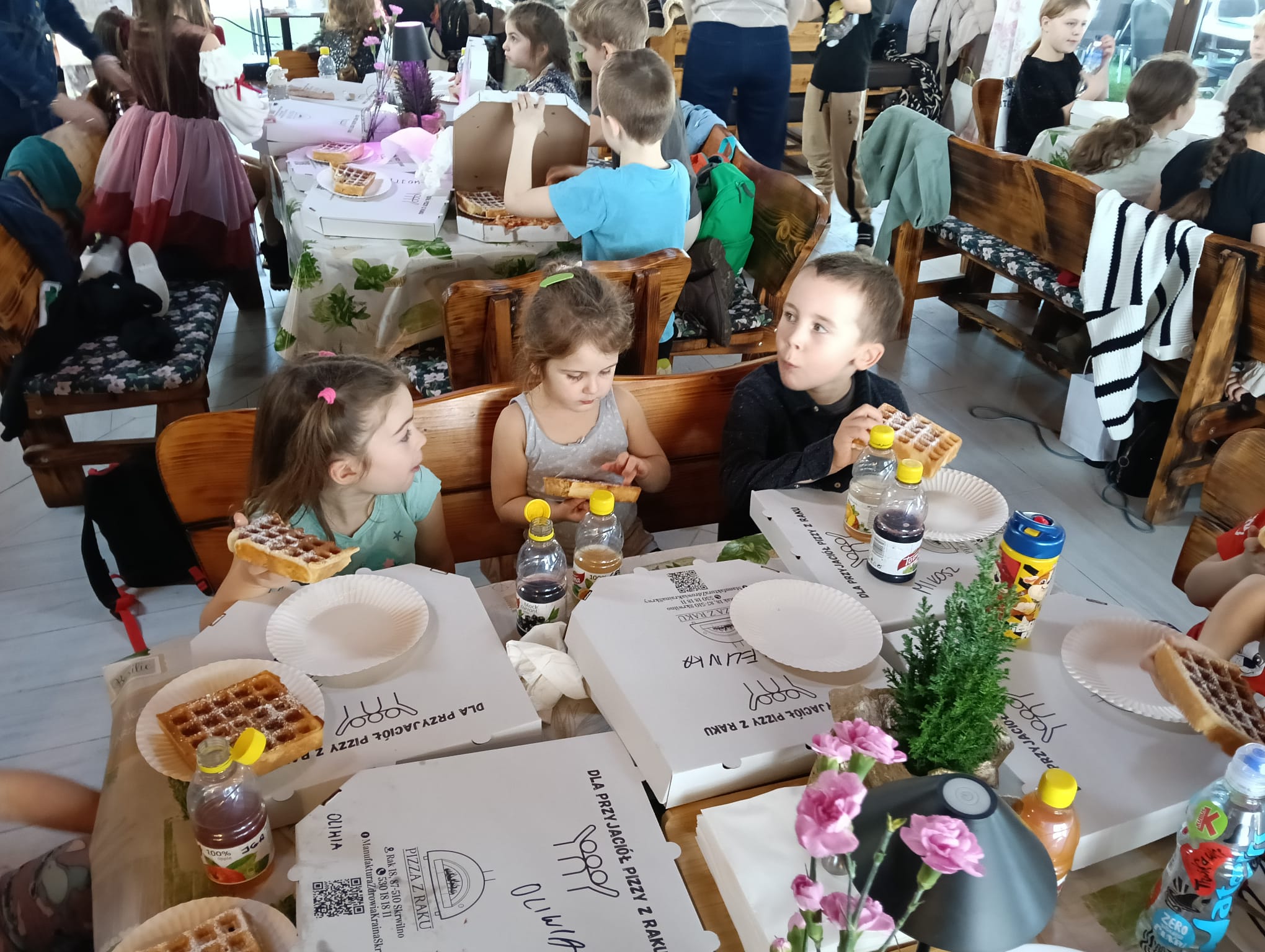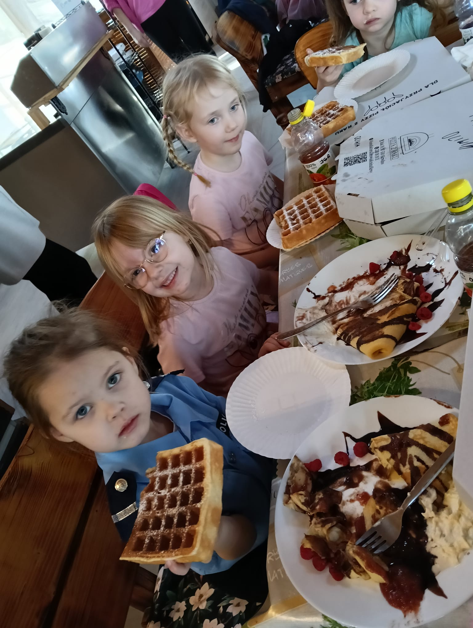 Gorąca pizza, słodkie naleśniki, gofry i soki owocowe dostarczyły dzieciom nie tylko energii do zabawy, ale również nadały naszemu spotkaniu rodzinnej , serdecznej atmosfery.